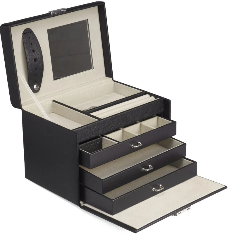 I de to nederste skuffer er der ét stort rum, og den øverste har 9 mindre rum samt specielle ‘plader’ til ørestikker. I toppen af skrinet er der plads til ringe og to separate rum, og i låget er der et indbygget spejl.