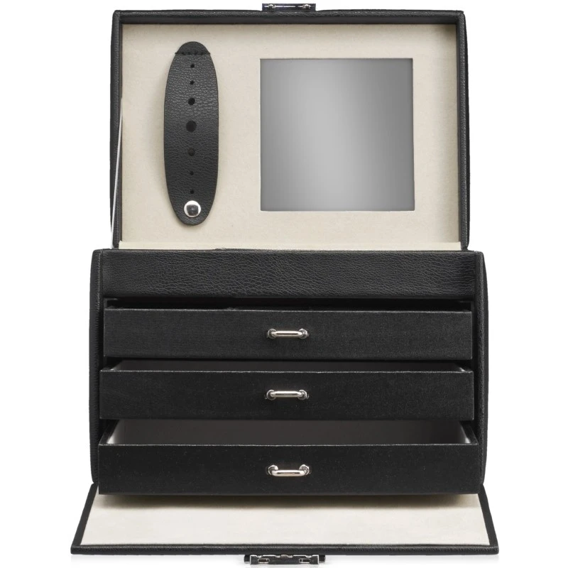 Gillian Jones Jewelry Box Vegan Black er et smykkeskrin, der udover at se godt ud i ethvert hjem med sit stilrene udseende også er utrolig praktisk. Den er indrettet med 3 bakker/skuffer, der kan trækkes ud så man kan få et overblik over indholdet.