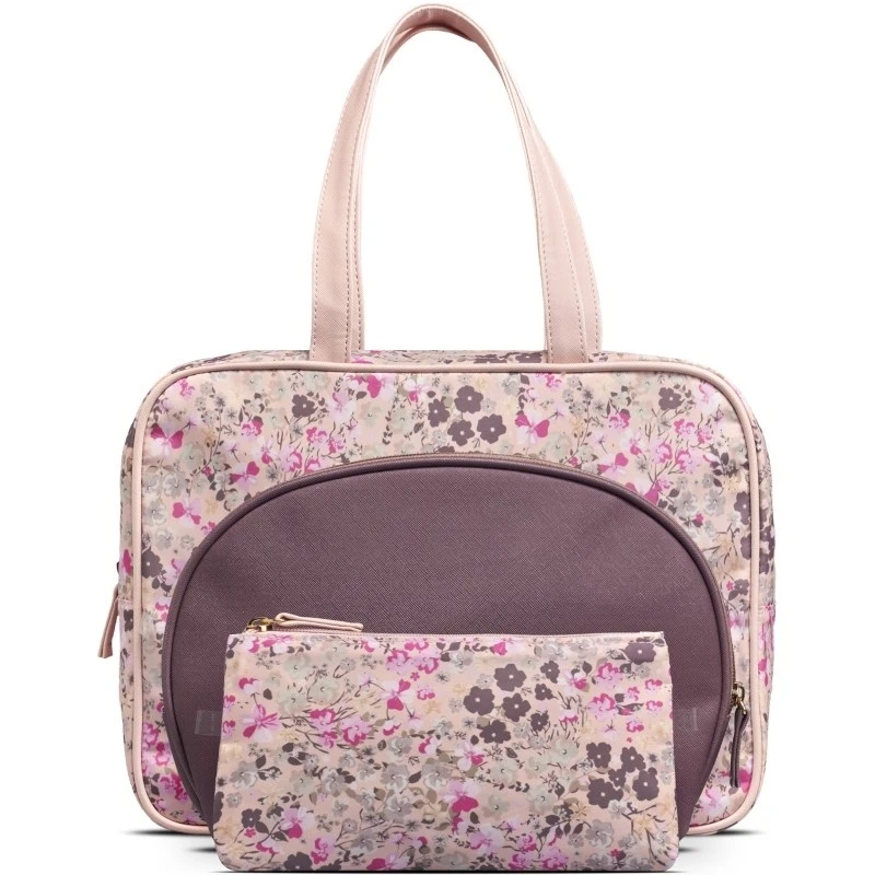 Den store toilettaske samt den lille toiletpung er lyserød med blomsterprint, mens den store toiletpung har en smuk blommefarve.