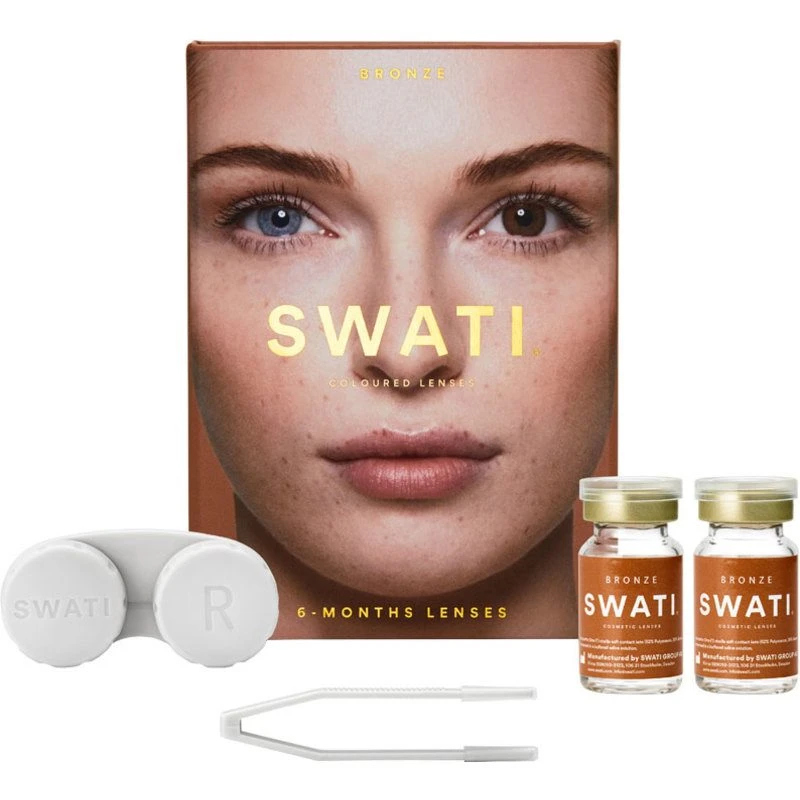 SWATI Cosmetics 6 Months Lenses – Bronze er farvede kontaktlinser, som kommer i en dyb, brun farve med et orange skær, der resulterer i et helt nyt, men stadig naturligt look. På denne måde giver linserne dig rig mulighed for at veksle mellem din naturlige øjenfarve og denne farvede linse.